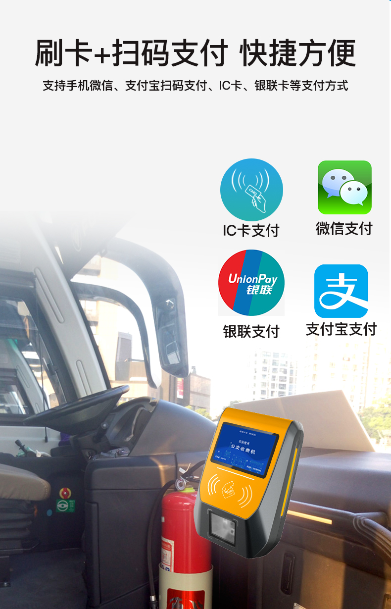 身份证验证乘车、二维码以及银联卡、社保卡、银行卡、老年卡、云闪付、腾讯微卡、交通联合卡、手机NFC支付等全支付功能和可定制二次开发等多样化支付方式