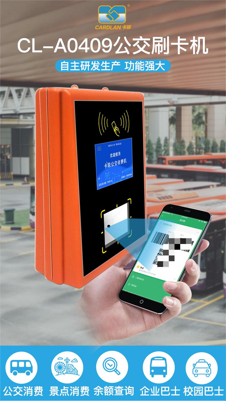 CARDLAN卡联微信支付宝扫码通勤车刷卡机CL-A0409C主要功能有无线通讯、GPS定位、IC卡读卡、电子支付、余额查询等。可用于公交消费、旅游景点、游乐场消费、余额查询、企业巴士。