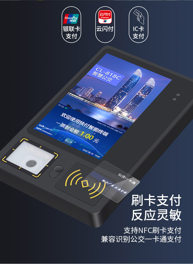 CARDLAN卡联公交人脸支付终端CL-818C是新一代设备支持身份证验证乘车、人脸识别、二维码以及各类刷卡支付、手机NFC支付等全支付功能,扫码支付1秒内响应,再结合卡联公交管理软件SAAS系统平台,大大降低了使用公司的投入成本、提高了运营效率,实现运营管理的安全化、智慧化、信息化。