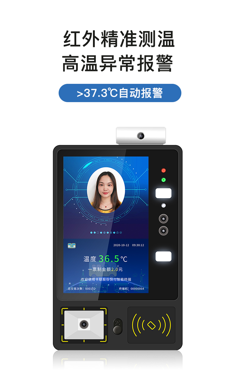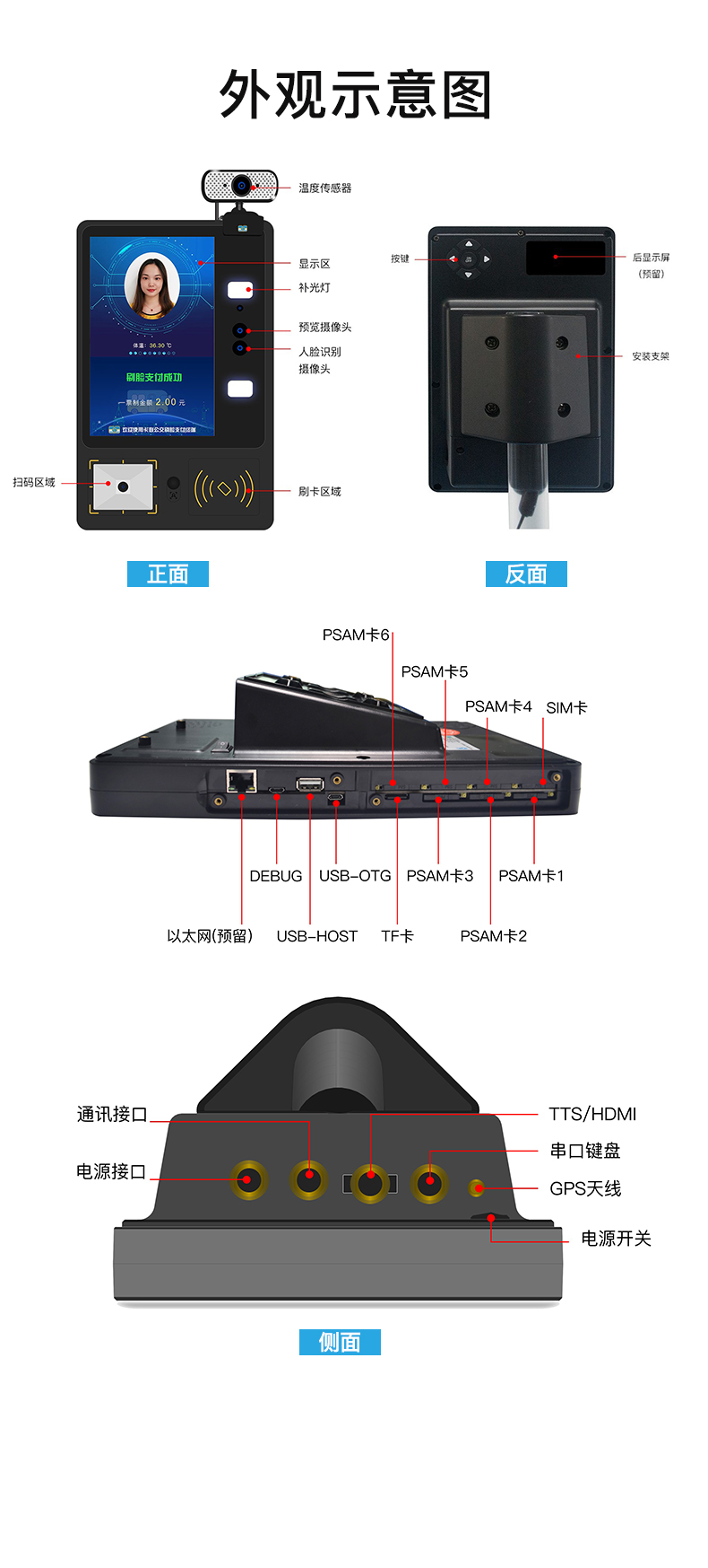 人脸识别、刷卡扫码、无线通讯、GPS定位、IC卡读卡、电子支付、余额查询、广告投放、测温、可定制二次开发等