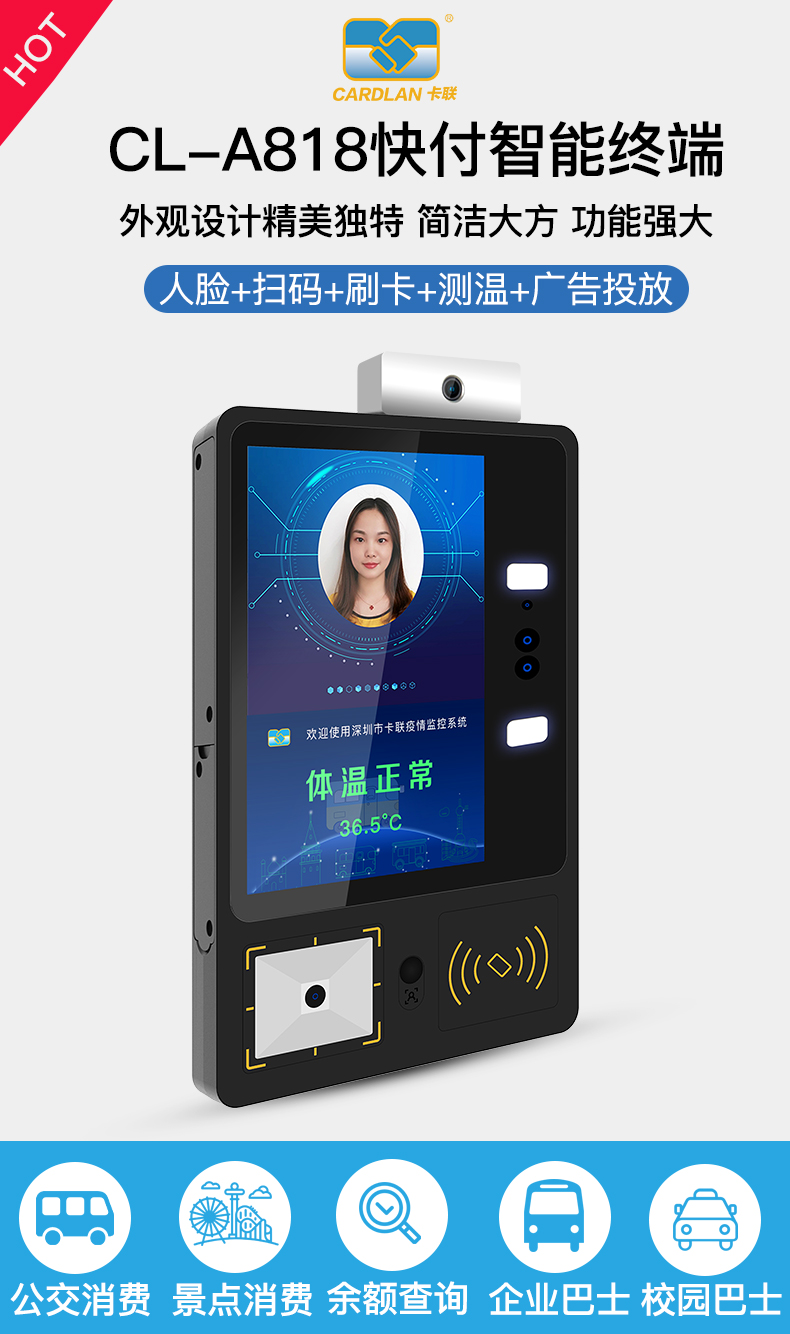 CARDLAN卡联公交车扫码刷脸测温收费机CL-818采用8英寸TFT-LCD显示屏,分辨率1280*800,支持扫脸、微信、支付宝、邦客惠APP、IC卡、银行卡等多样化支付方式,扫码支付1秒内响应,再结合卡联公交管理软件SAAS系统平台,大大降低了使用公司的投入成本、提高了运营效率,实现运营管理的安全化、智慧化、信息化。