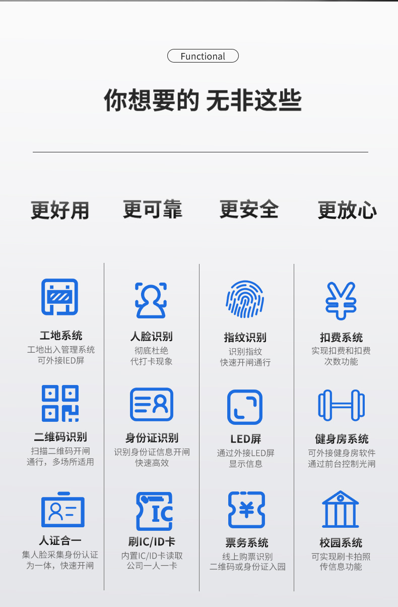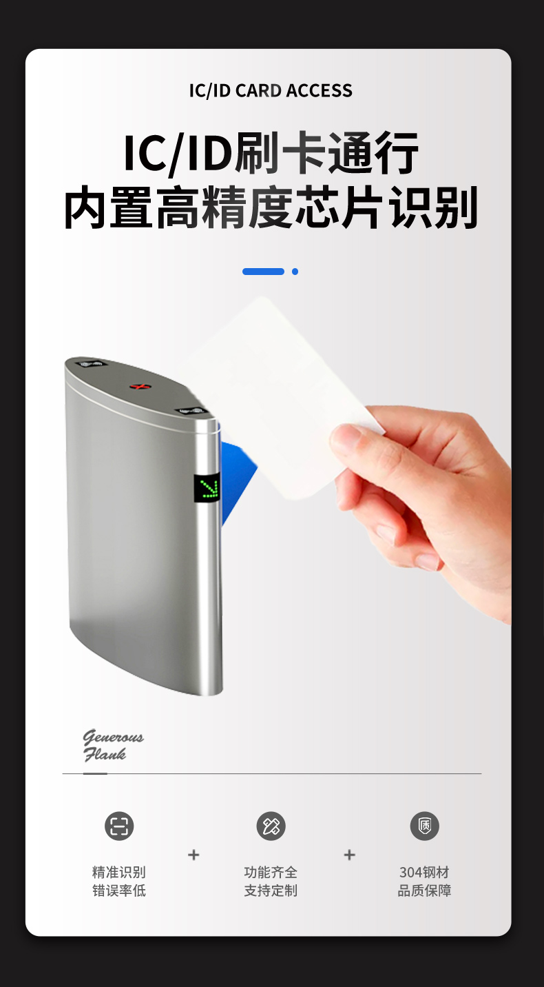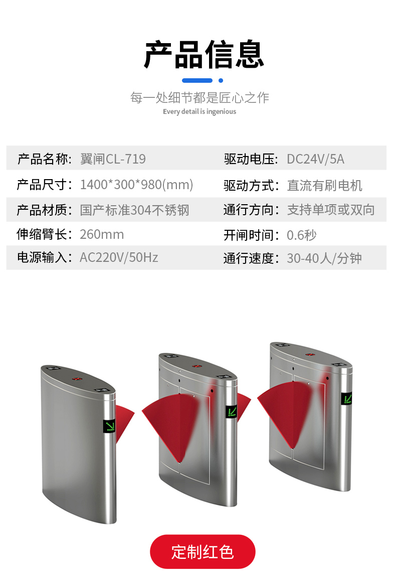 人脸识别通道闸机不锈钢翼闸CL-719该设备将机械、电子、微处理器控制及各种身份识别技术有机地融为一体,方便兼容人脸识别、IC卡、ID卡、条码卡、指纹等读卡识别设备的使用,通过选配各种身份识别系统设备和采用性能可靠的安全保护装置、报警装置、方向指示等,协调实现对通道智能化控制与管理等。分为:单机芯:用于单通道和多通道;双机芯:用于多通道。
