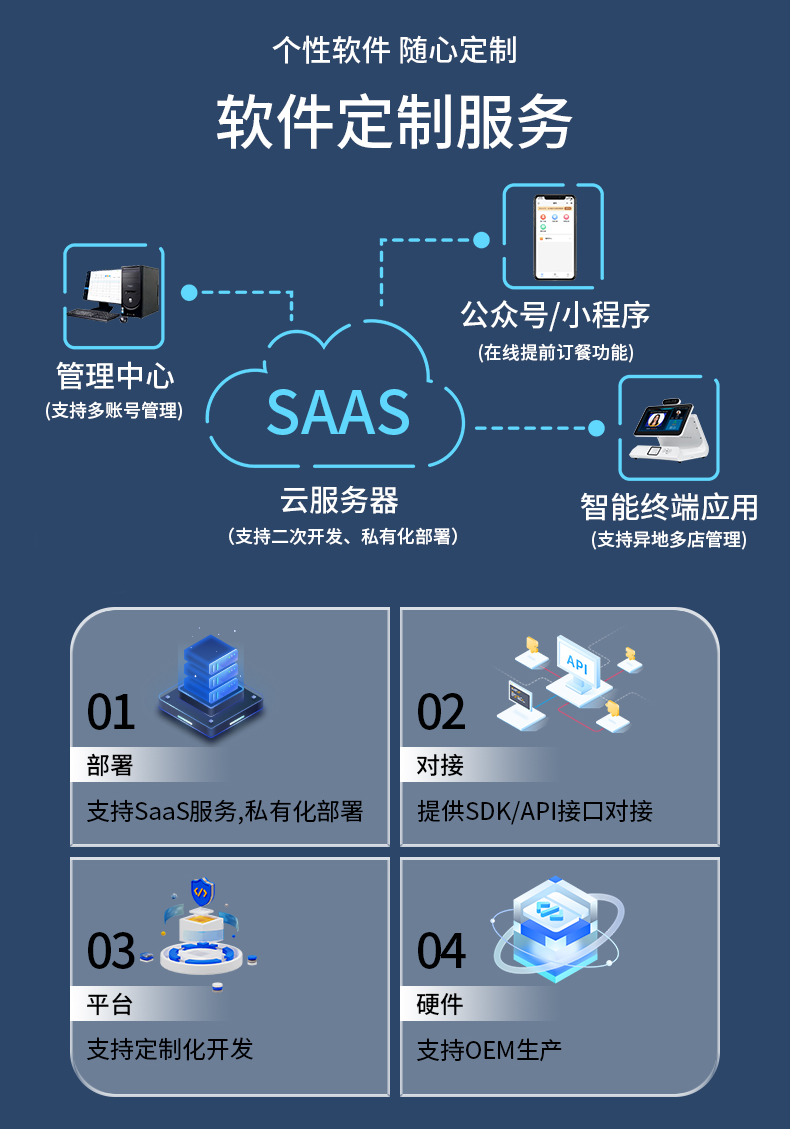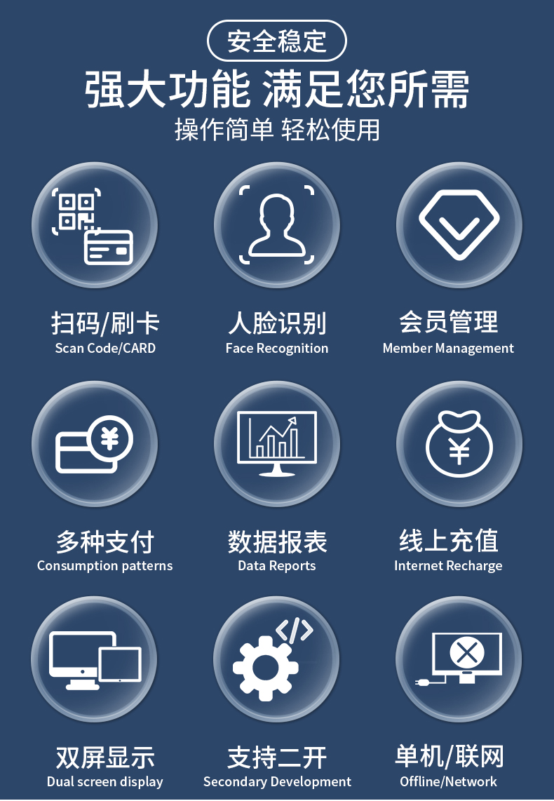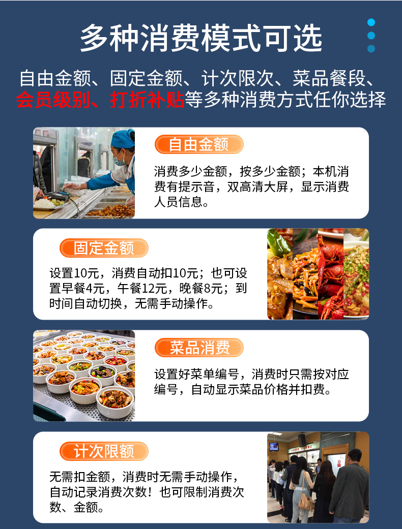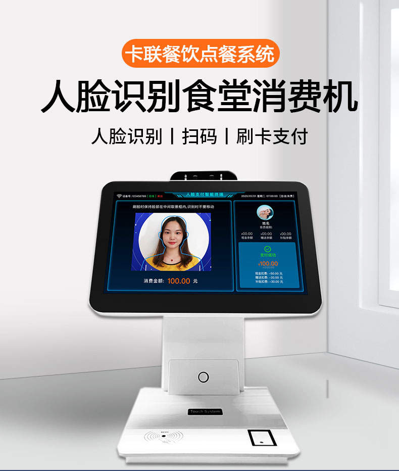 食堂饭卡管理系统采用世界领先的人脸特殊3D算法,配合高速处理器,具有人脸识别速度快、人脸识别距离远、人脸活体检测、人脸离线识别、双镜头,5万人脸库、 超大语音播报等特点。支持刷卡消费,扫码消费,人脸识别消费,可以扩展到人脸识别闸机消费、人脸识别餐台消费机、人脸识别称重消费机、人脸识别订餐消费机,车载人脸识别消费等等;