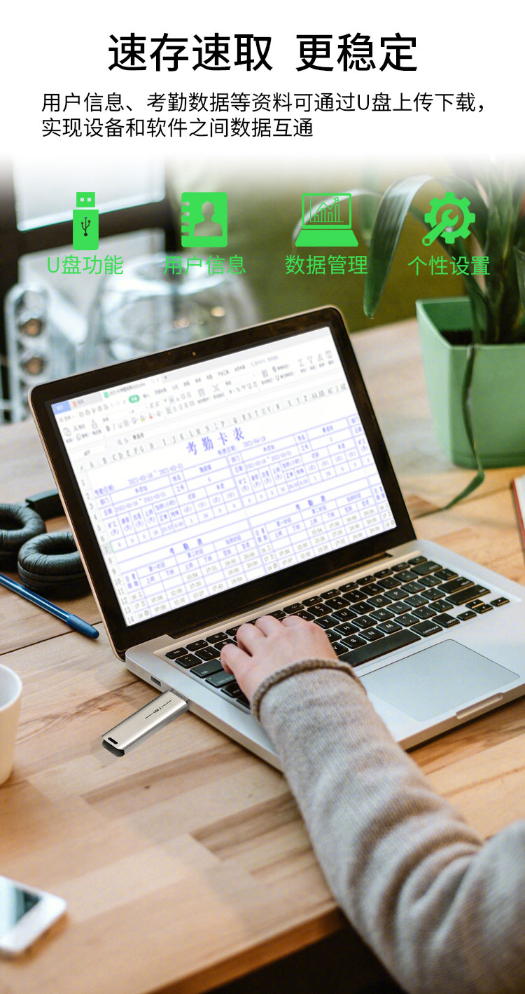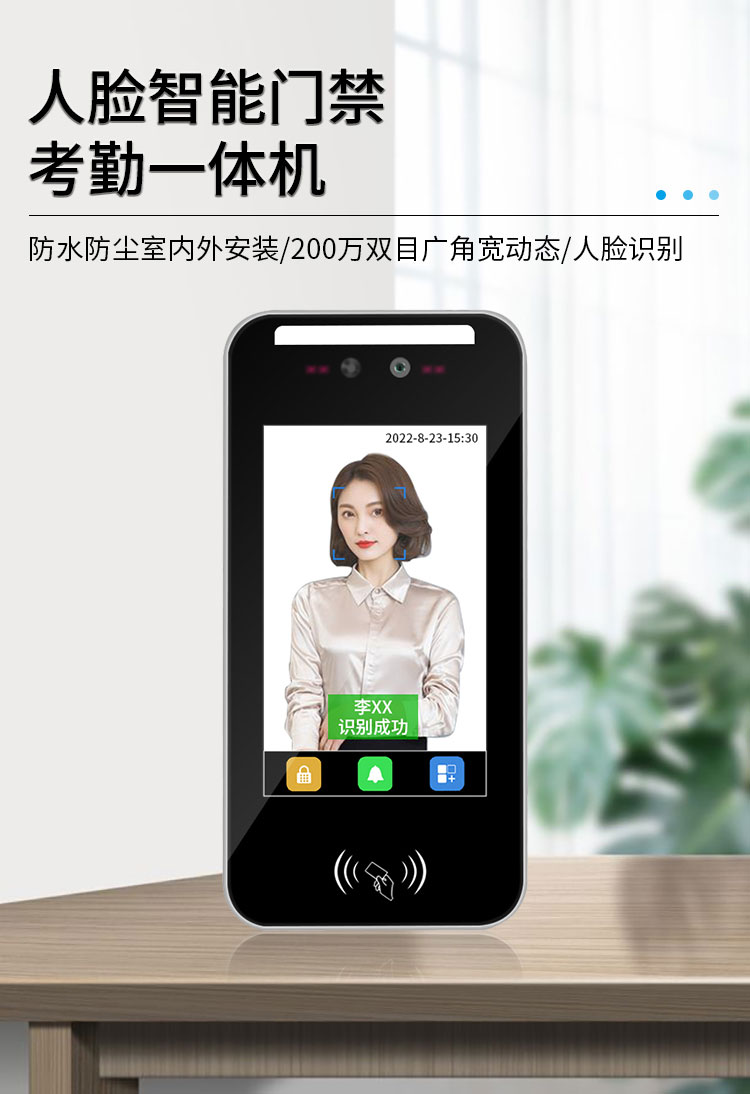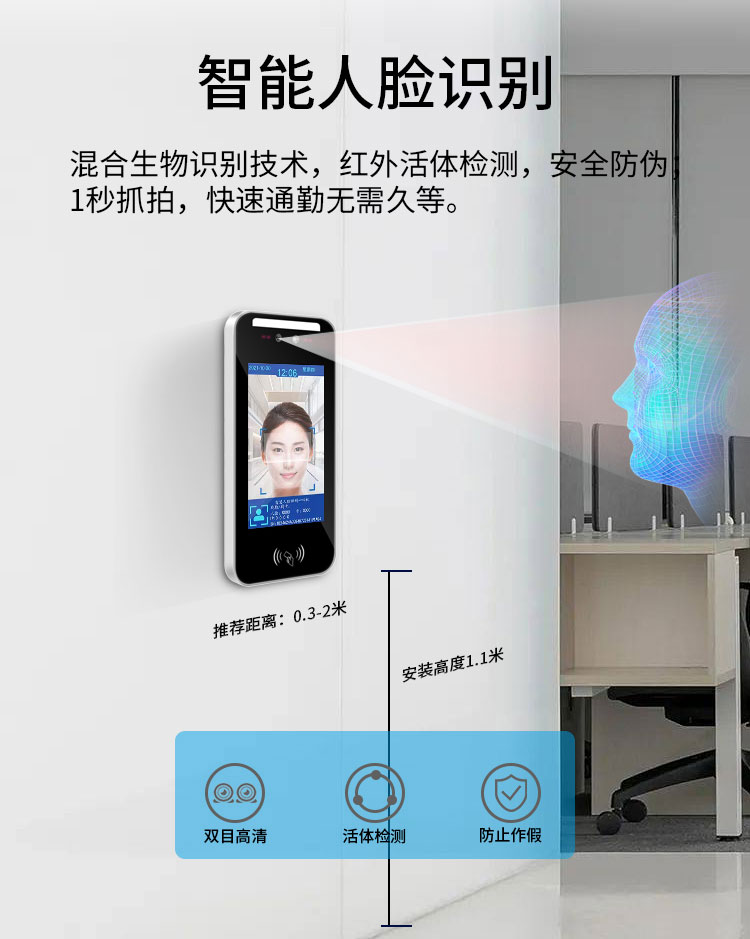 人脸智能门禁打卡一体机采用7英寸高清触摸大屏,运用多重补光技术,各种暗光、背光、侧光环境全天候适应,RBG+红外双目活体人脸识别检测,出入无忧,无缝对接企业考勤系统,自动生成报表