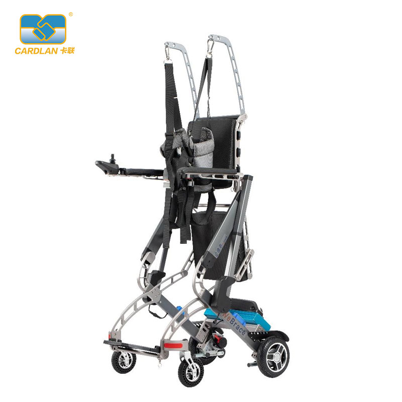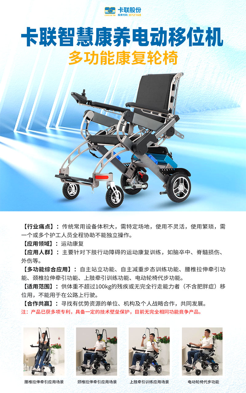 卡联康复行走机器人具有自主站立功能、自主减重步态训练功能、腰椎拉伸牵引功能、颈椎拉伸牵引功能、上肢牵引训练功能、电动轮椅代步功能。
