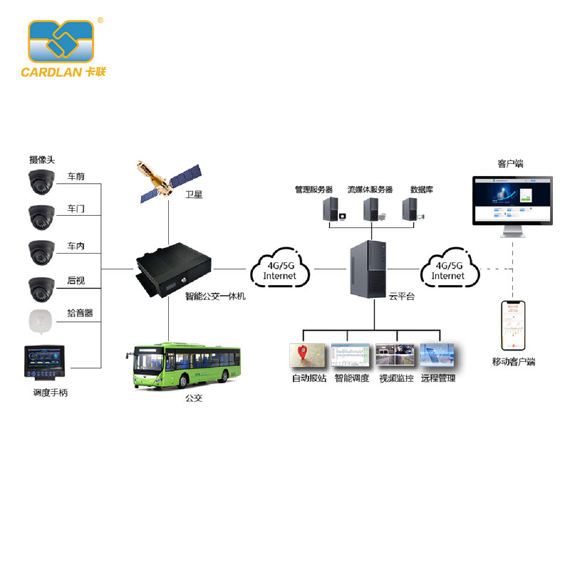 3、公交实时调度:公交线路实时直线图、电子地图。实时对车辆和人员进行调度调整。实时音视频预览、语音对讲、消息下发。实时电子路单、司机考勤、报警处理等功能集。