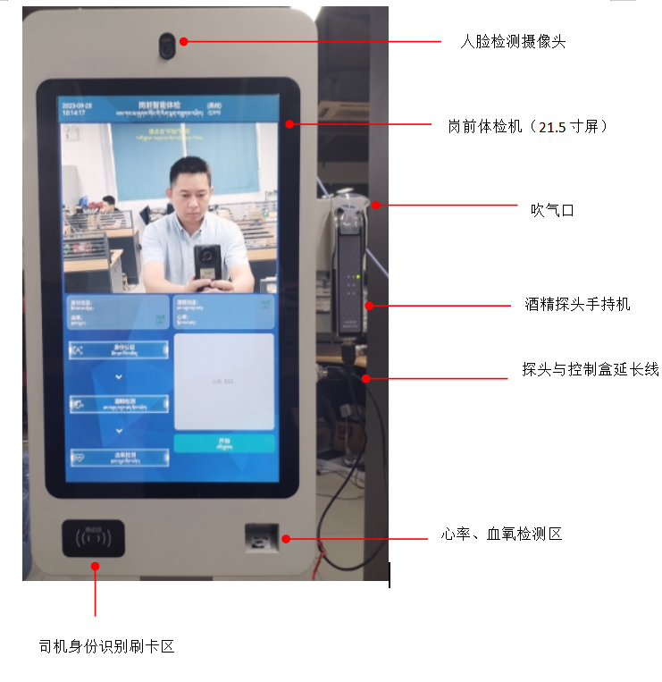 岗前体检机智能钥匙柜是集钥匙存取与司机岗前检测为一体的人脸识别智能钥匙管理设备。驾驶员上岗前通过岗前酒精体检一体机人脸检测后,进行酒精吹气检测,血氧检测、心率检测,检测记录可同时发送给后台管理系统,异常报警等功能或选配方案。