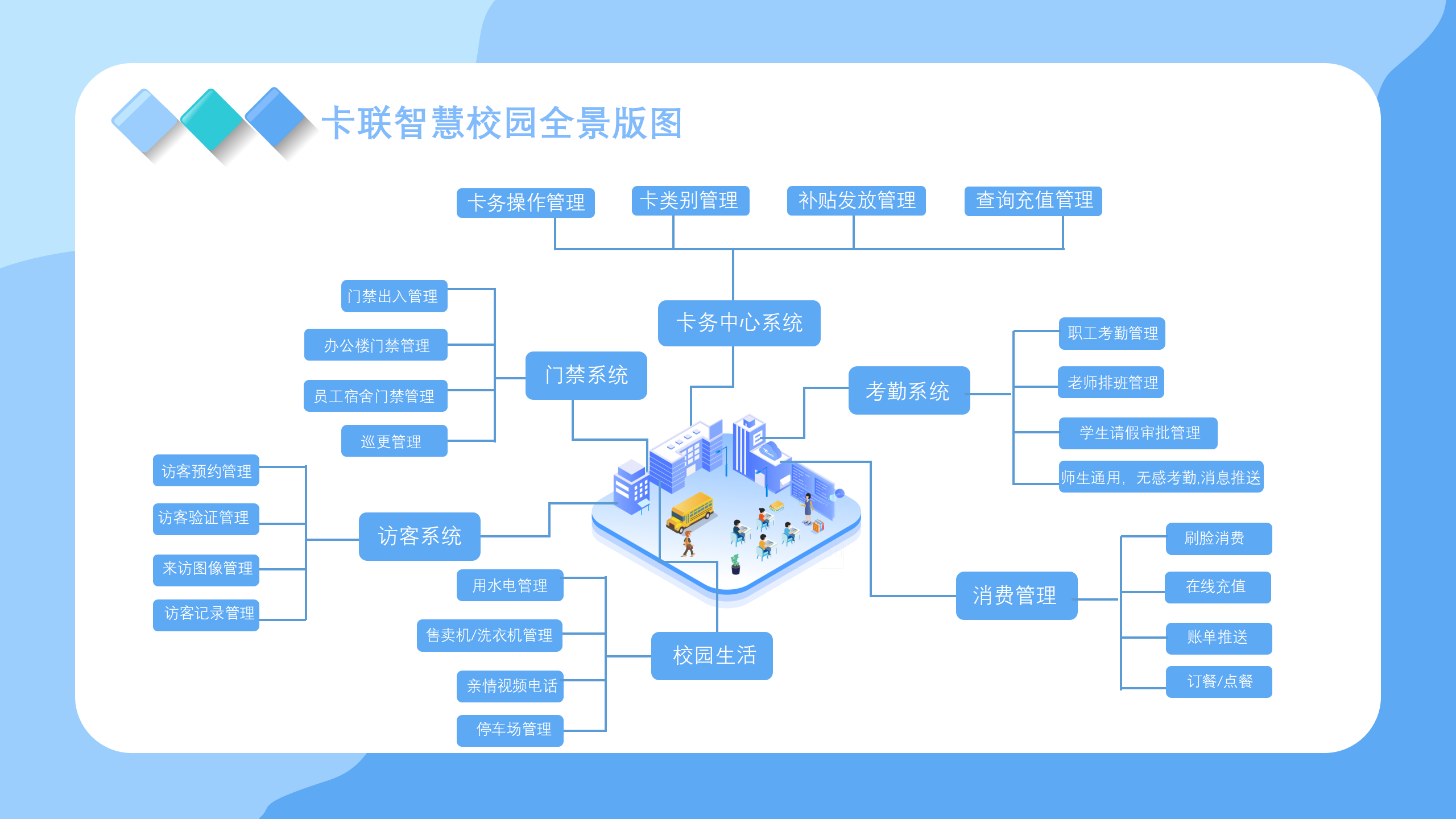 6、便捷消费系统:食堂、便利店、超市、小卖部、洗衣房、校园医疗等网点,师生可以使用实体卡、消费虚拟卡或人脸进行消费。
