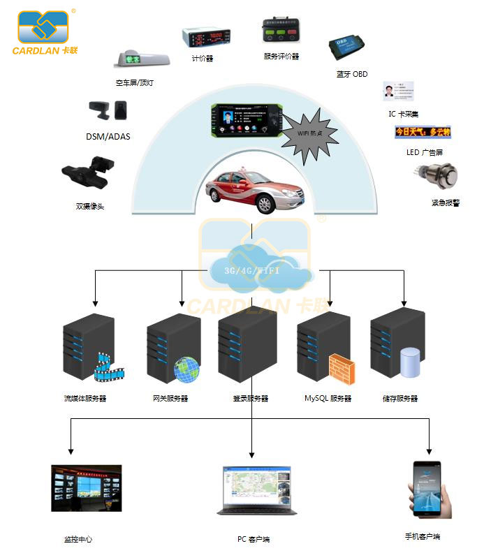 卡联出租车视频监控管理系统具有高清视频监控、车辆定位监控、车辆的实时预警、驾驶人行为分析、人脸抓拍核验、乘客不打表载客监管、前排乘客评价、后排乘客评价、电召(网约)服务、离车评价、电子支付结算、信息发布以及综合运营分析等功能。