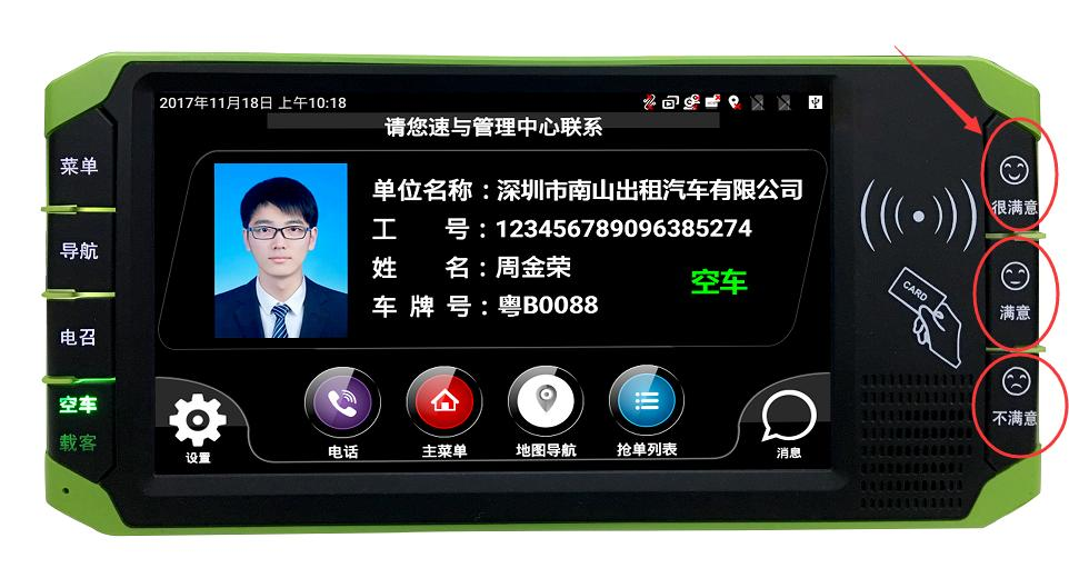服务评价器安装在副驾驶座位后方,便于后排乘客进行服务评价。服务评价器上设置有“满意”、“基本满意”、“不满意”等服务评价选择内容,到达目的地,驾驶员抬起空车牌,语音提示乘客“请您对本次服务进行评价”