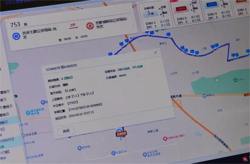 记者通过熊明强的智能网联手机软件,看到2台正在行驶的智能网联公交车当日上车下车人数、行驶速度等信息。